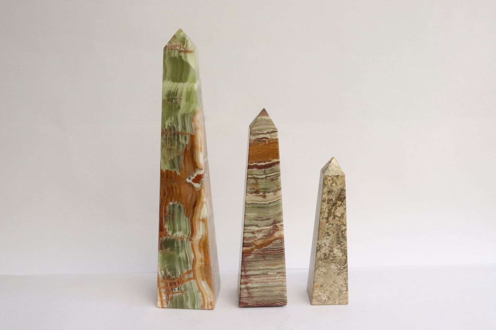 SoldAgate & Jasper Stone Obelisk Prisms, 3 3360 cts3 carved natural gemstone obelisk prisms , total 3360 cts., 1 agate natural stone with dyed fuchsia, grey and white Quartz. 5 x 1 3/8 in. The others are a purple Jasper with inclusions of other QuartzSee Sold Price