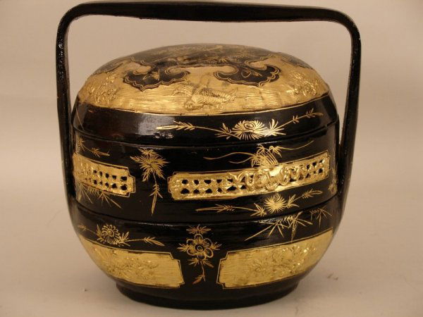 SoldCHINESE 3-TIERED WEDDING BOX WITH RAISED DETAILChinese. Black lacquered handled wedding or marriage box, possibly box wood, having three-tiers with raised carved scroll dragon detail with a distressed finish, on a platform base. Unmarked. Approx.See Sold Price