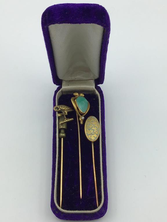 Victorian Assorted Stickpin Lot4 days LeftAntique Victorian Stickpin Lot with Stickpin Holder4 days LeftLot of 3 Vintage Costume Bug PinsMar 05, 2026Lot of 3 Unusual Early Gold Pins20 hrs LeftA lot of three antique 18 kt gold stick pins7 days LeftVICTORIAN JEWELRY LOT5 days LeftLot of Antique JewleryMar 02, 2026VICTORIAN 8 TO 10K GOLD LOT5 days LeftASST. VICT./CONTEMPORARY GOLD STICK PINS/EARRINGS, ETC.4 days LeftWound Badge in Black Stick PinAntique 14kt Gold Chatelaine Sewing Needle CaseFeb 28, 2026Antique 14kt Diamond Stick Pin, Tri-Color , Art Deco, 1920's(3) 14K Gold Stick Pins (Carved Jade, Amber, Dia.)Feb 28, 2026Two Antique Gold Tone Stick Pins including an Art Nouveau Gibson Girl GOLDMar 12, 2026Antique Victorian Stick Pin 18k Yellow Gold Pearl Pink SpinelFeb 26, 2026An 18 kt Gold and nickel stick pin with an oval opal-colored stone7 days Left