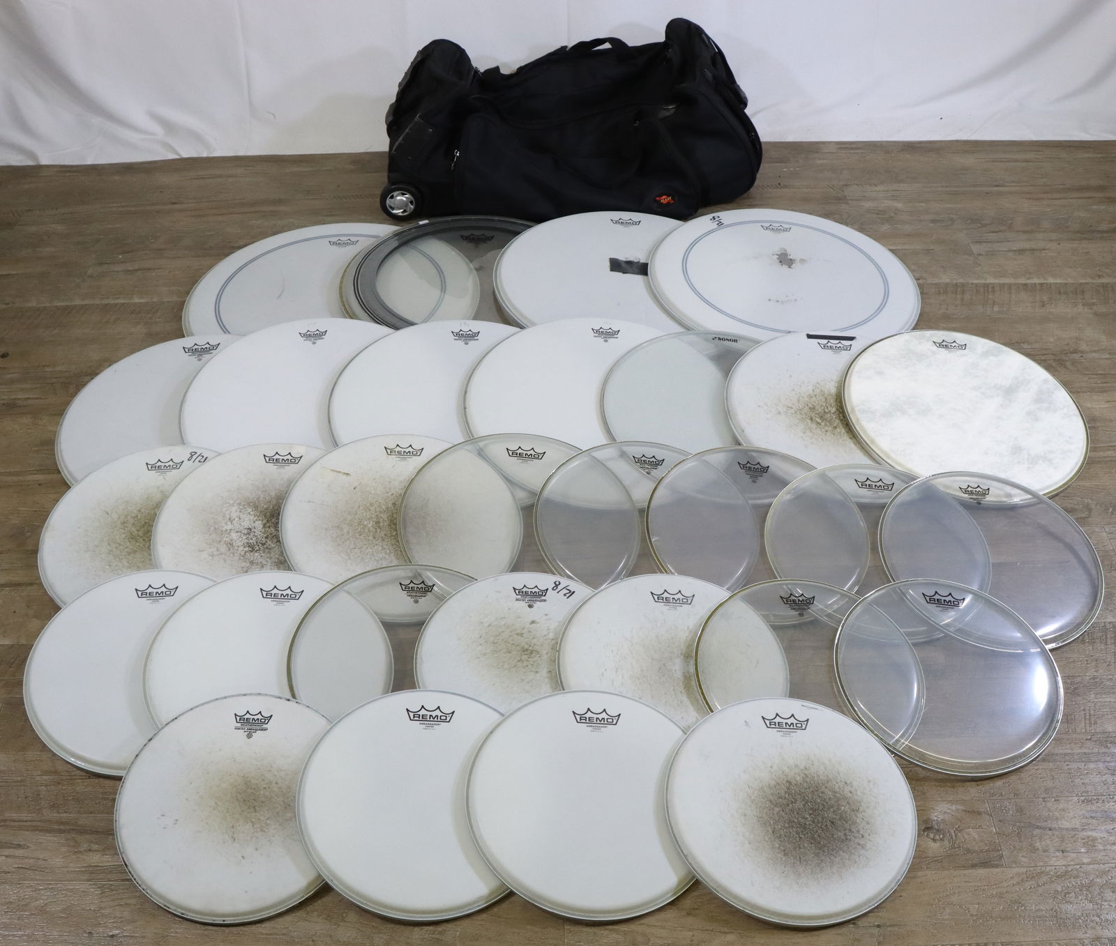 30 Plus Assorted Drum Heads with Wheeled Accessory Bag