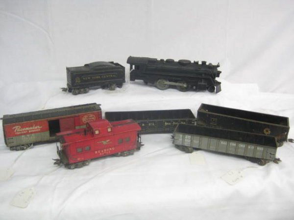 SoldIves 1132 Wide Gauge Freight Setcirca 1920-26, painted cast iron 0-4-0 electric steam loco, 40 N.Y.C. & H.R. tender (some chipping and paint crazing), 191 coke car, 193 stock (early restored roof), 192 Merchandise car and 195 caboosSee Sold Price