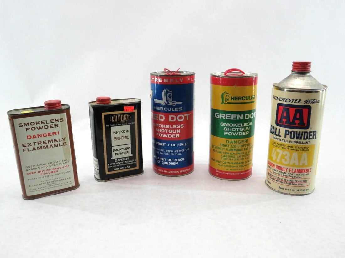 Oil Tins Lot5 days LeftOil Tins Lot5 days LeftOil Tins Lot5 days LeftOil Tins Lot5 days LeftLOT OF VINTAGE POWDER / TALC TINSFeb 26, 2026Collection of Four Vintage Smokeless Gunpowder Tins, Hercules, DuPont, and Hodgdon, circa6 days Left3 Antique Powder Tins w Schaghticoke Powder CoMar 07, 2026Assorted Rimfire & Centerfire Ammunition Approximately 600 Rounds .22 LR, 9mm, .38 SPL, .32 ACP7.25lbs. Assorted Smokeless Powder9lbs. +/- Assorted Gun PowderGroup of 9 Car Care and Additive Advertising CansMar 08, 20262.5lbs. +/- IMR 4350 PowderGroup of 9 Auto Additive Advertising CansMar 01, 20265lbs. +/- IMR 4198 PowderGroup of 8 Auto Additive Related Advertising CansMar 01, 20265lbs. +/- IMR 4064 Powder