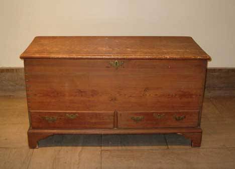 SoldNew England Pine Blanket Chest, ca. Early 19th c.A pine blanket chest with lift-top compartment over two dovetailed drawers. Exposed dovetail case construction, brass bail drawer pulls, forged iron hinges, and simple bracket feet. Original finish. NSee Sold Price