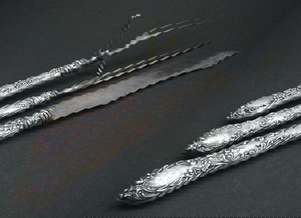 SoldSteiff Sterling Silver Handled Carving SetSteiff sterling silver handled carving set with repousse floral handles. Largest: 14 1/2" long, 1 3/4" wide. Smallest: 12 1/2" long, 1 3/4" wide.See Sold Price