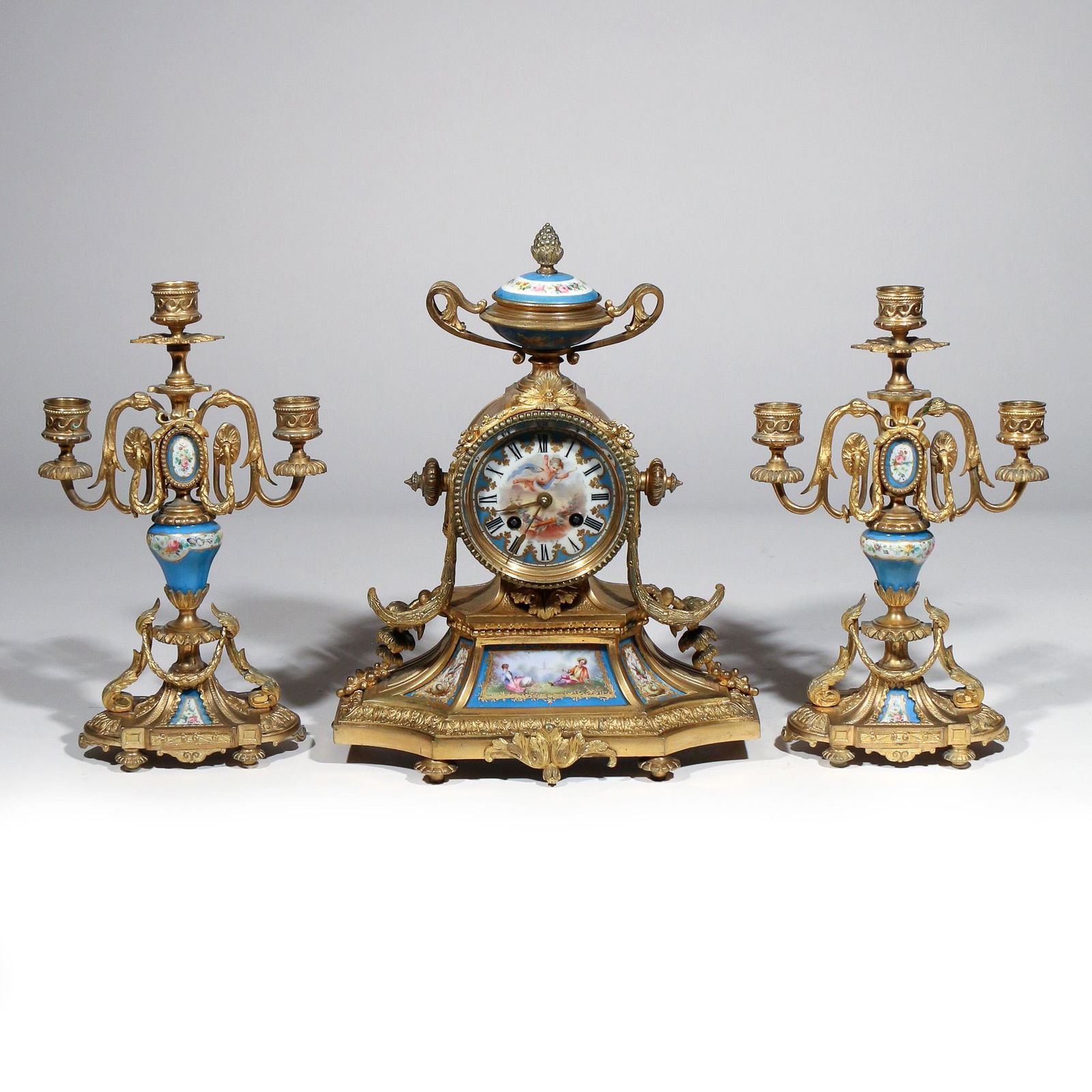 Antique French Gilt Bronze 'Sevres' Mantle Clock Garniture Set - Three piece garniture set of mantelAntique French Gilt Bronze 'Sevres' Mantle Clock Garniture Set - Three piece garniture set of mantel clock and pair candelabras. Each with ormolu bronze and Sevres style inset handpainted porcelain. P