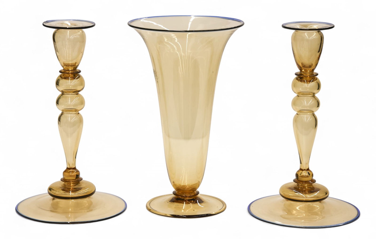 3pc Steuben Celeste Blue Vase and Candlesticks