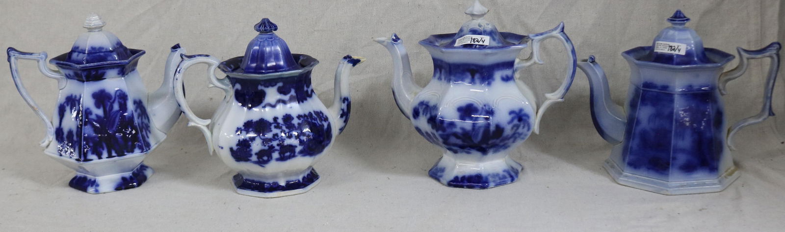 4 19TH C. FLO BLUE TEA POTS, VARIOUS PATTERNS, 8