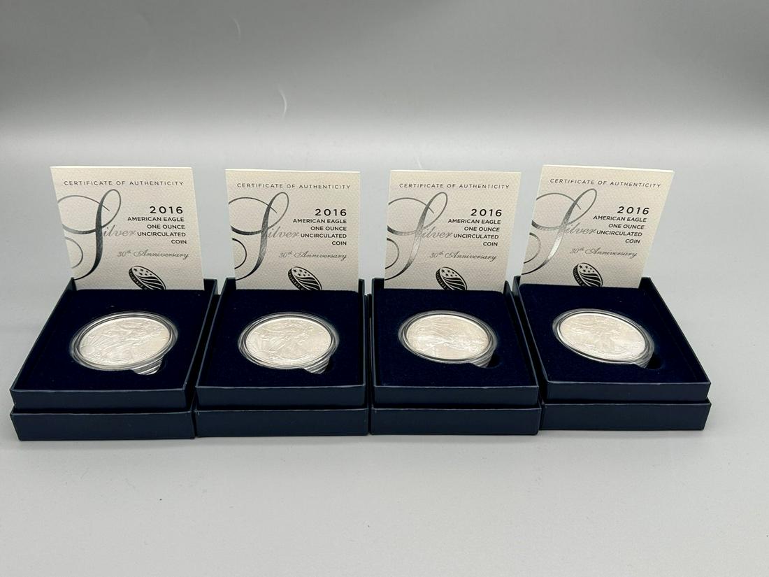 (4) 2016 Uncirculated American Silver Eagles in Boxes With COA's