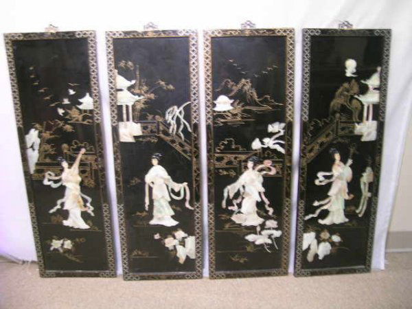 4 ASIAN BLACK LACQUER INLAY WALL PANELS