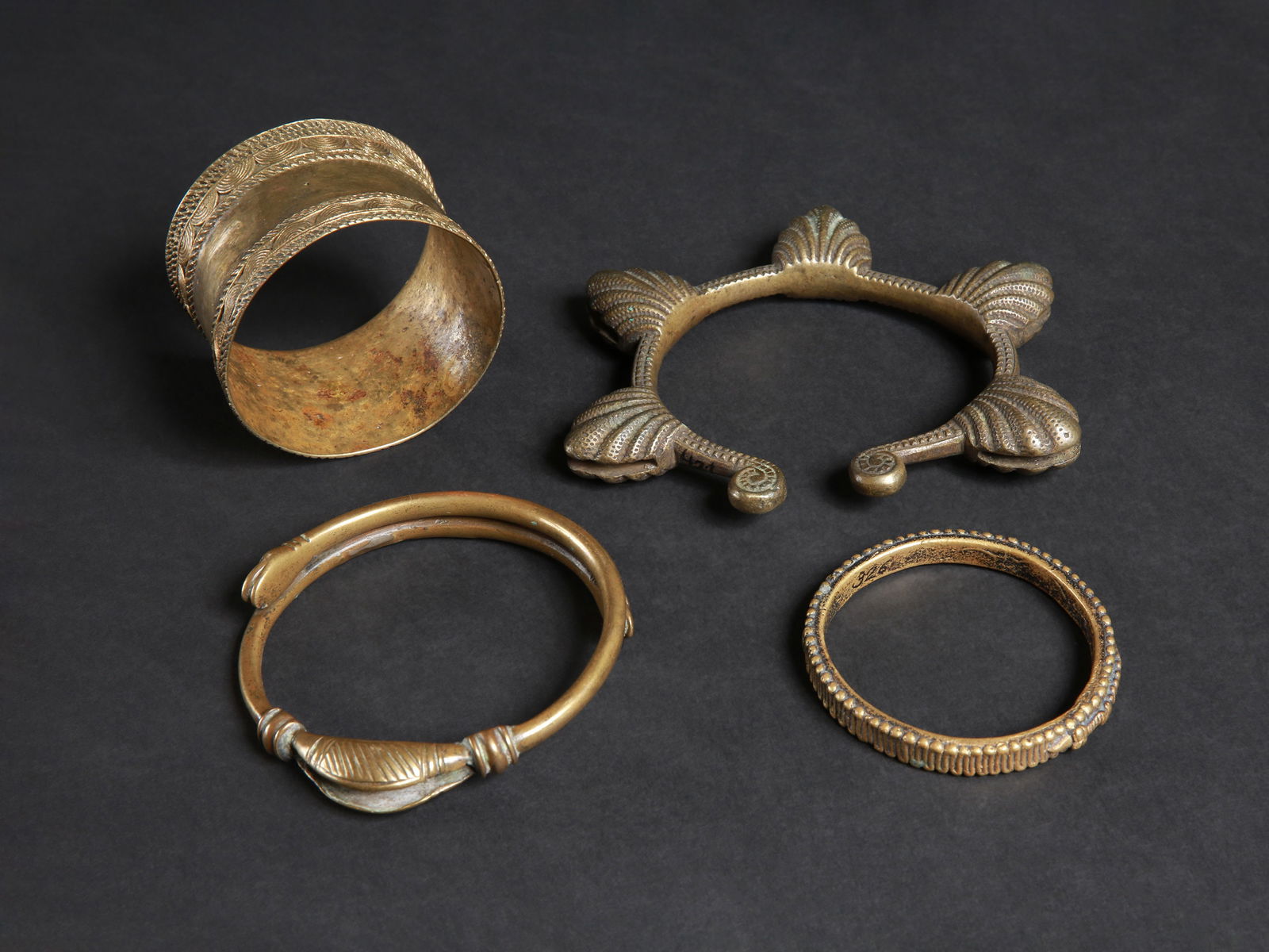 SoldA Pair of Philippine Carved Wood Bowls and Four AfricanA Pair of Philippine Carved Wood Bowls and Four African Bronze Currency Bracelets on Metal Stands 20th Century Largest: height 3 1/2 x width 11 5/8 x depth 8 1/4 inches. Property from the Collection oSee Sold Price