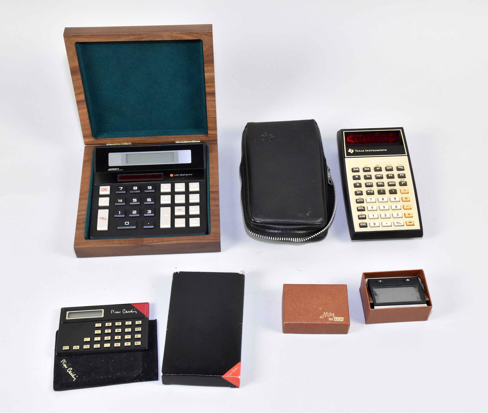 (4) CALCULATORS W/CASE: Alcraft Solar LCD, walnut case,