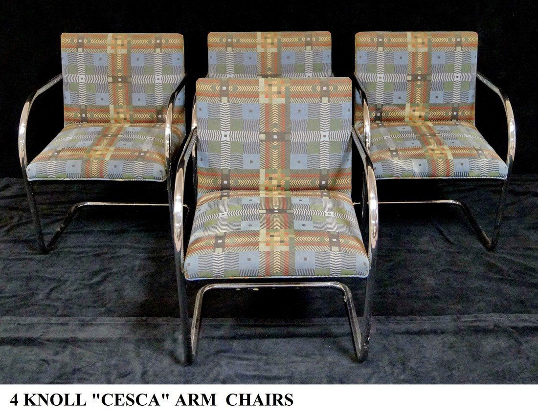Set 4 KNOLL Arm Dining Chairs. Mid Century Modern LINDA and JOSEPH RICCHIO designed Chairs. UpholsteSet 4 KNOLL Arm Dining Chairs. Mid Century Modern LINDA and JOSEPH RICCHIO designed Chairs. Upholstered Seats. Knoll metal label. Dimensions: Height: 31.5 inches, Width: 21.75 inches, Depth: 24 inches