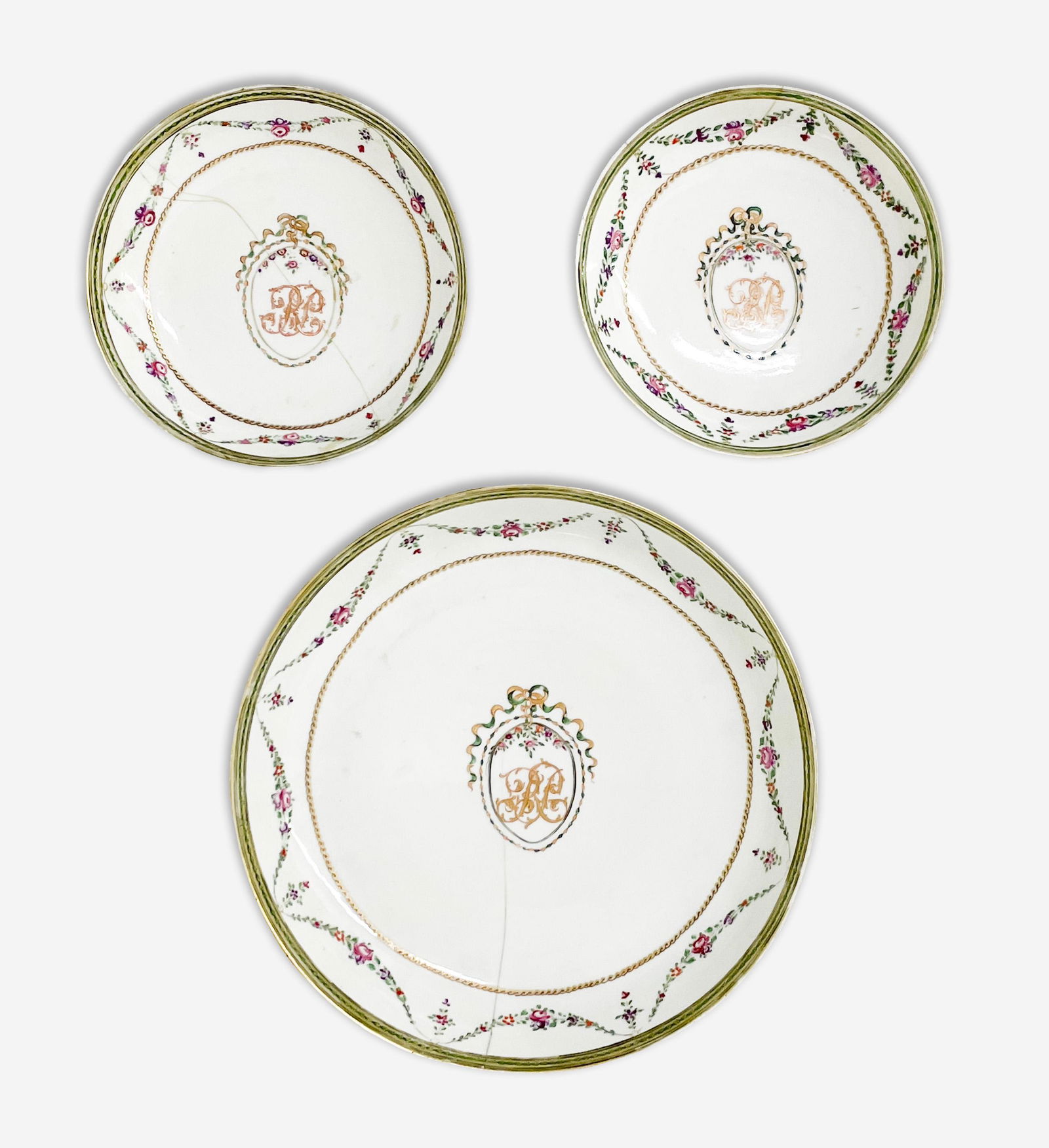 4 Chinese Export Monogramed Bowls (1 Broken)