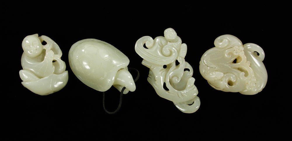 Sold4 Chinese Ming/Qing White Jade Pendants4 Chinese Ming/Qing Dynasty White Jade Pendants, the Basket end of a swinging Jade Flower Basket, a Squirrel & Grapes, a Monkey on Horse and a small Lingzhi pebble. Approximate width of basket 2 1/8 iSee Sold Price