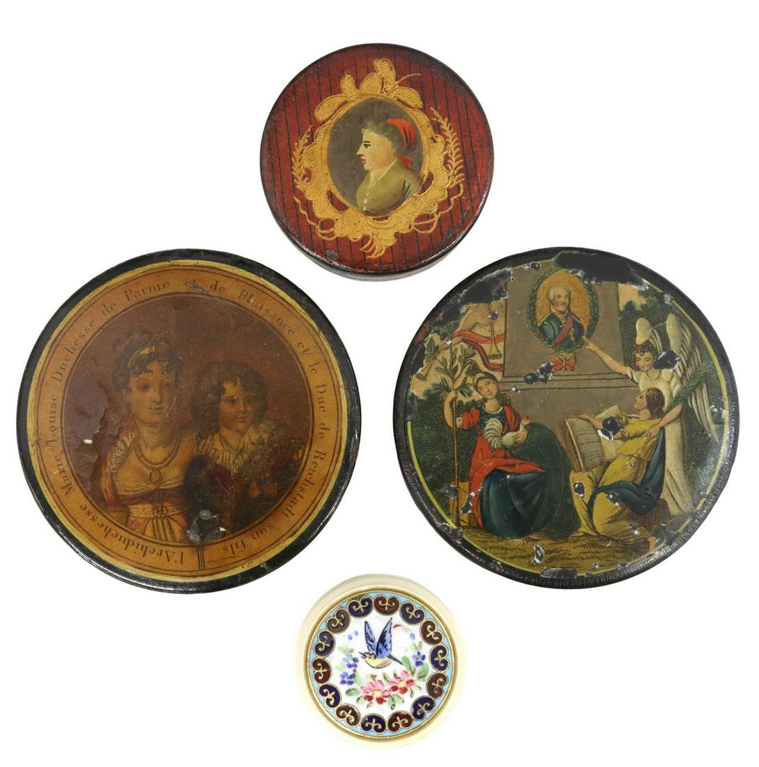 4) FRENCH PAPIER-MACHE SNUFF BOXES, BONE DICE CASE