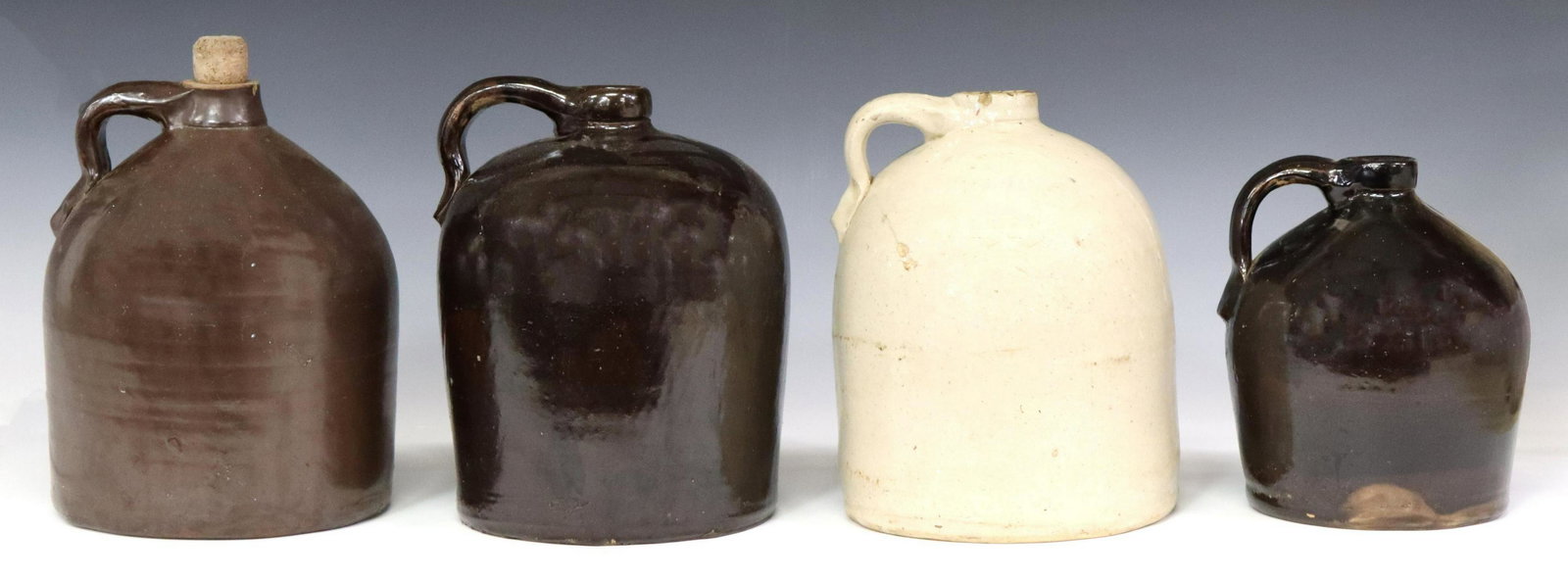 (4) GLAZED STONEWARE JUGS WITH PULLED HANDLES