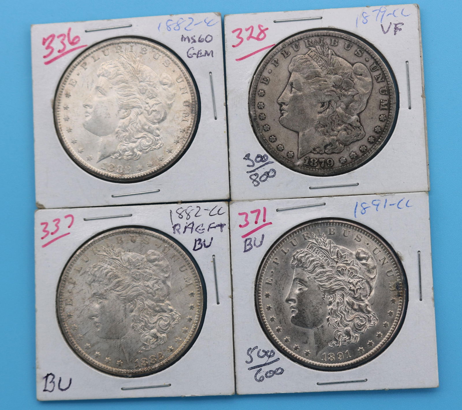 4 MORGAN CARSON CITY SILVER DOLLARS, 1879 CC, VF