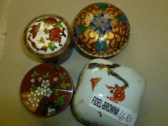 Onyx, Porcelain & Enamel Trinket Boxes 4pc LOTFeb 26, 2026ENAMEL LOT OF TRINKET BOXES PILLBOXES INCL. HEREND, LIMOGES, NEIMAN MARCUS4 days LeftLot Of Three Vintage Russian Lacquered Paper Mache Round BoxesFeb 28, 2026Lot of Two Chinese Ceramic Trinket boxes5 days LeftJoblot 7 Vintage Pill Boxes Trinket Boxes(3pc) Vintage Porcelain Trinket Boxes6 hrs Left(4) JAPANESE LACQUERED TABLE BOXES, 1 WITH MOP INLAY3 days Left5 Vintage Japanese WWII Era Military Sake Cups5 days Left3 Assorted Fine China Dishes - Made in Germany - Hand Painted2 days LeftFour Very Fine Trinket BoxesFeb 27, 2026Chinese Porcelain and Metal Trinket Box5 days Left5 Porcelain BoxesMar 14, 2026Set of four Asian cloisonné enamel pieces2 days Left4 Snuff BoxesMar 14, 2026Vintage Group of Trinket Boxes and Solid Perfume CompactsMar 05, 2026Asian Lacquer Coaster Sets, Tea + Trinket Boxes5 days Left