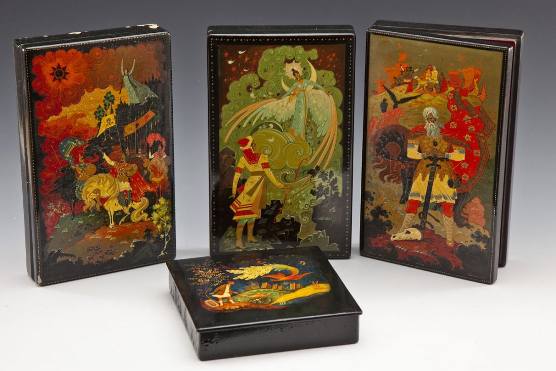 4 Palekh School Russian Painted Lacquer BoxesDESCRIPTION: Four Palekh School Russian painted lacquer boxes. Includes: 1) Firebird 4-3/4" x 1-3/4" x 4-7/8". 2) The Dead Princess (aka Snow White). 6-1/4" x 1-7/8" x 4". 3) The Snow Maiden painted iSee Sold Price