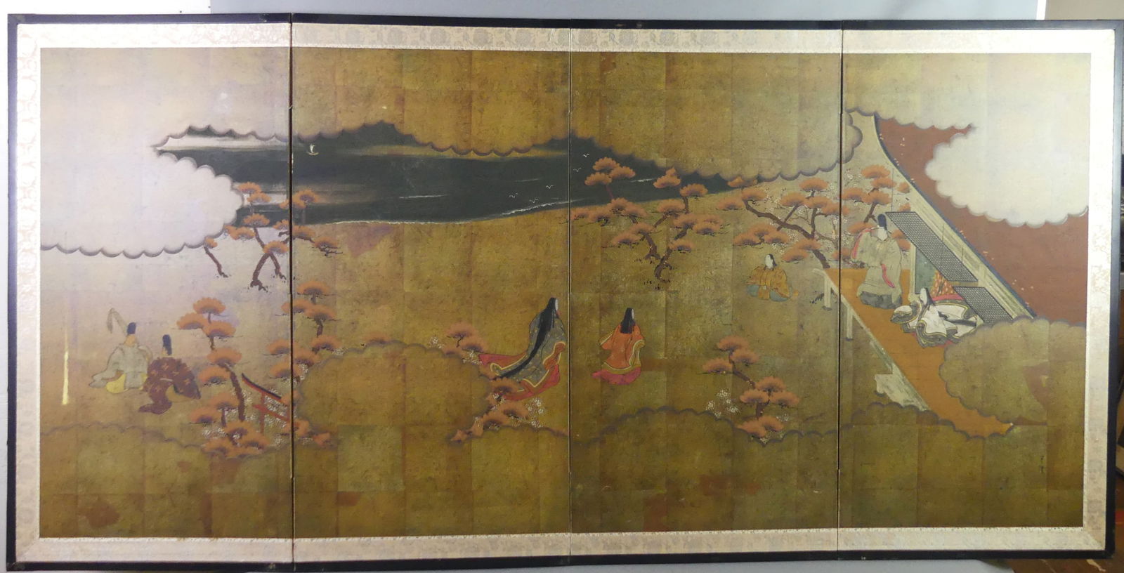 Sold4 Panel Meiji Period Japanese Screen4 panel Japanese floor screen, Meiji Period, circa 1900. Having blank gold inner panels with gold silk foliate borders with black enameled wood surround with decorative brass hardware Measures: 48" HSee Sold Price