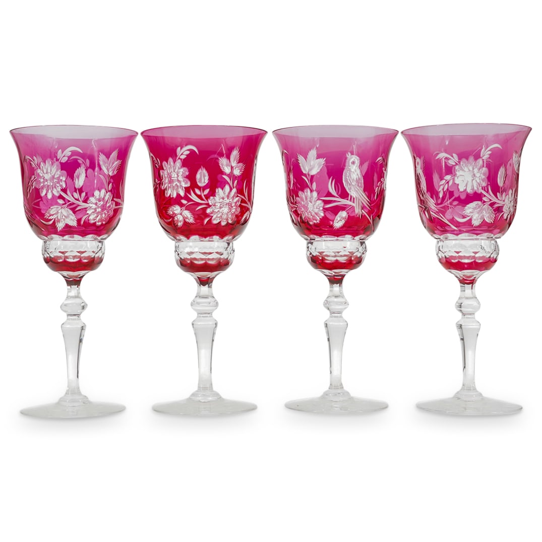 (4 Pc) 1920s Val St Lambert Cranberry Crystal Bird Pattern Water Goblets