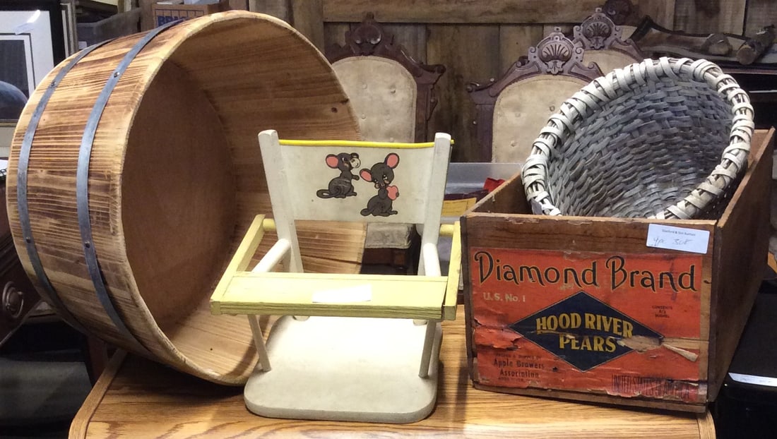 Toy LotFeb 21, 2026Longaberger Basket Lot Inc. 12 Assorted Sized and Style BasketsMar 02, 2026Lot Baskets & Trays - 5 Chinese Rattan & Reed Sewing Baskets, Harvest Basket, Tray + Bamboo2 days Left(2) pc. Country lot to include a brass pail & rush seat childs chair in old dark greenish paint,1 day LeftEstate lot of wire baskets and L & M vintage metal sign, sign measures 18" x 24", sign has some rust1 day Left2 Vintage wood ammunition Crates, Peters & UnionASSORTED LONGABERGER BASKETSFeb 13, 2026ASSORTED LONGABERGER BASKETSFeb 13, 2026Painted Wicker Side Chair & Swedish Trunk4 days LeftASSORTED LONGABERGER BASKETSFeb 13, 2026WDE MICKEY MOUSE LAUNDRY SET & MORE2 days LeftChinese Bamboo & Rattan 3 Tiered Wedding Basket 21 1/2" H X 16" W X 13" D Filled w/Sewing2 days Left4pcs Assorted Danish Side Tables, Cupboard, ETC.4 days LeftA vintage Pine one drawer table together with a Pine bookcase/shelf unit and a chair; table 74 x 857 days Left4 pcs Vintage Raikes Bears Stuffed Bear Dolls in Original Boxes, incl. 17019 Kevi Bear! See pics.4 Pcs. Wicker - Chair 35" H X 15 1/2" W X 14" D, Table 26 1/2" H X 21" Diam., Small Stand 34" H X 9"2 days Left