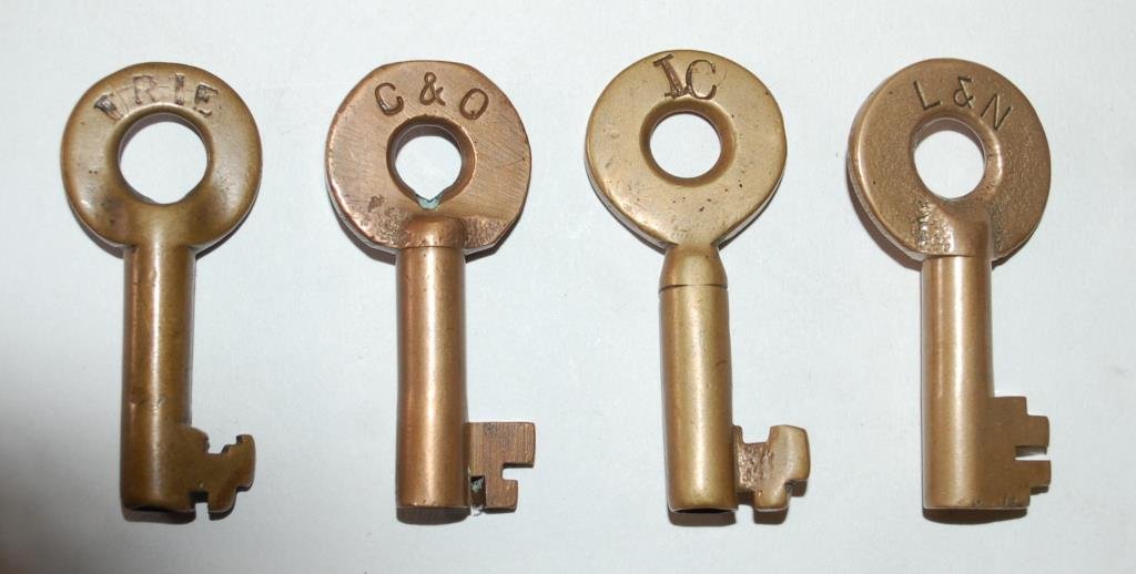 SoldRailroad Lock Keys (4), select Illinois-Elgin RR LinesID Marks: EJ&ERR (Elgin Joliet & Eastern RR); AE&CRR (Aurora Elgin & Chicago RR); EJ&E (Elgin Joliet & Eastern); Date: Country (if not USA): State: Illinois City: Elgin Provenance:See Sold Price