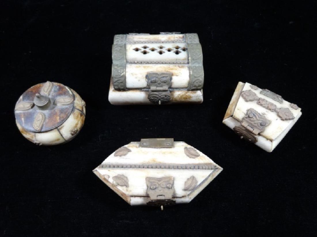 4 SMALL CAMEL BONE BOXES, APPROX 2" X 2"