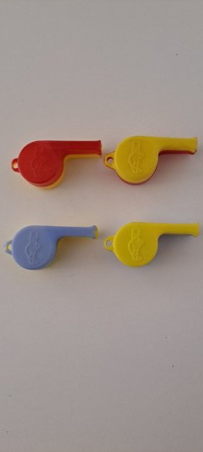 4 two tone plastic mr peanut whistles