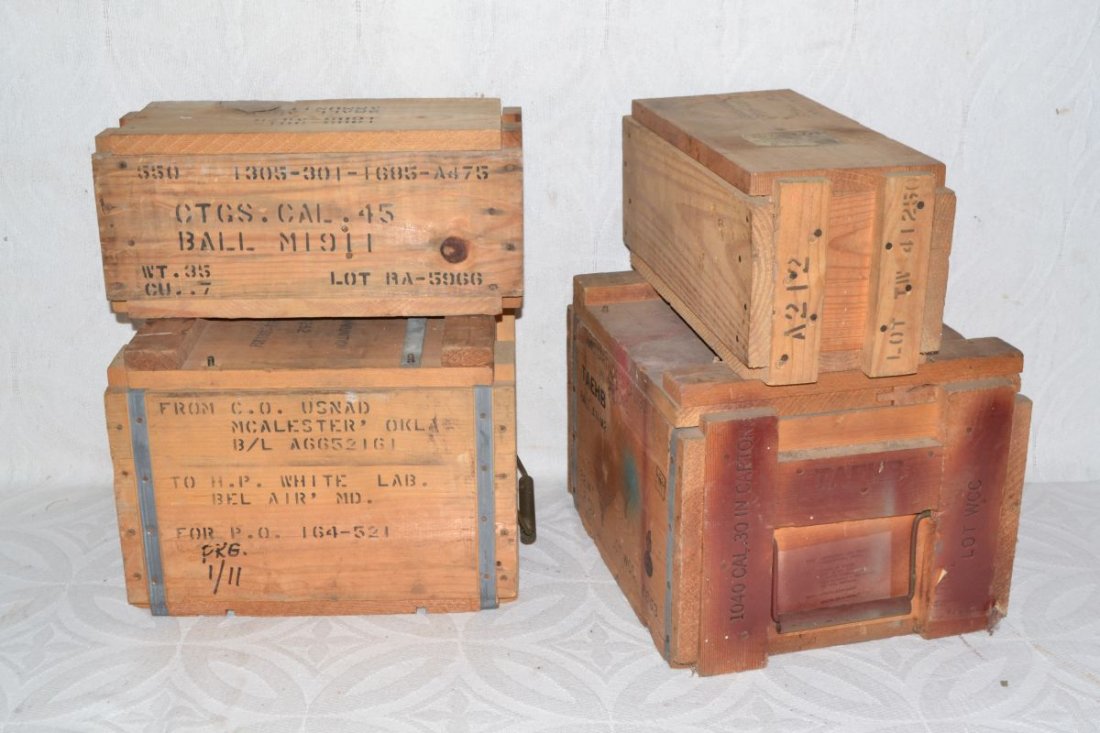 Sold4 Vintage Wood Ammo Boxes / Crates4 Vintage Wood Ammo Boxes / Crates - 9 in tall x 14 x 10See Sold Price