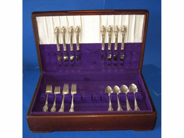 Sold40 Pcs Gorham Sterling Flatware English""40 Pcs Gorham Sterling Flatware English": 3 tablespoons, 11 teaspoons, 8 soup spoons, 1 butter spreader, 6 cocktail forks, 4 salad forks, 7 dinner forks, 1 serving spoon, 7 knives; 48 Toz. (knives notSee Sold Price