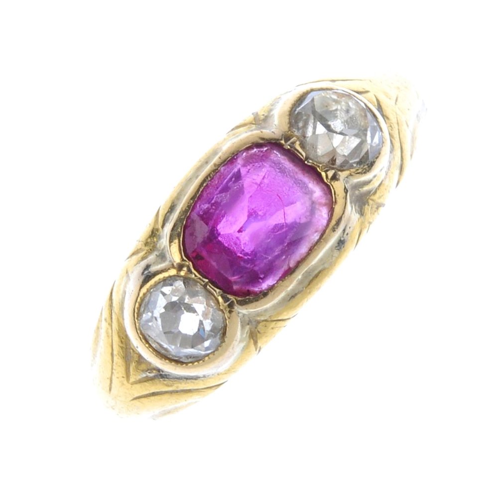 (4174-2-A) A ruby and diamond three-stone ring. The