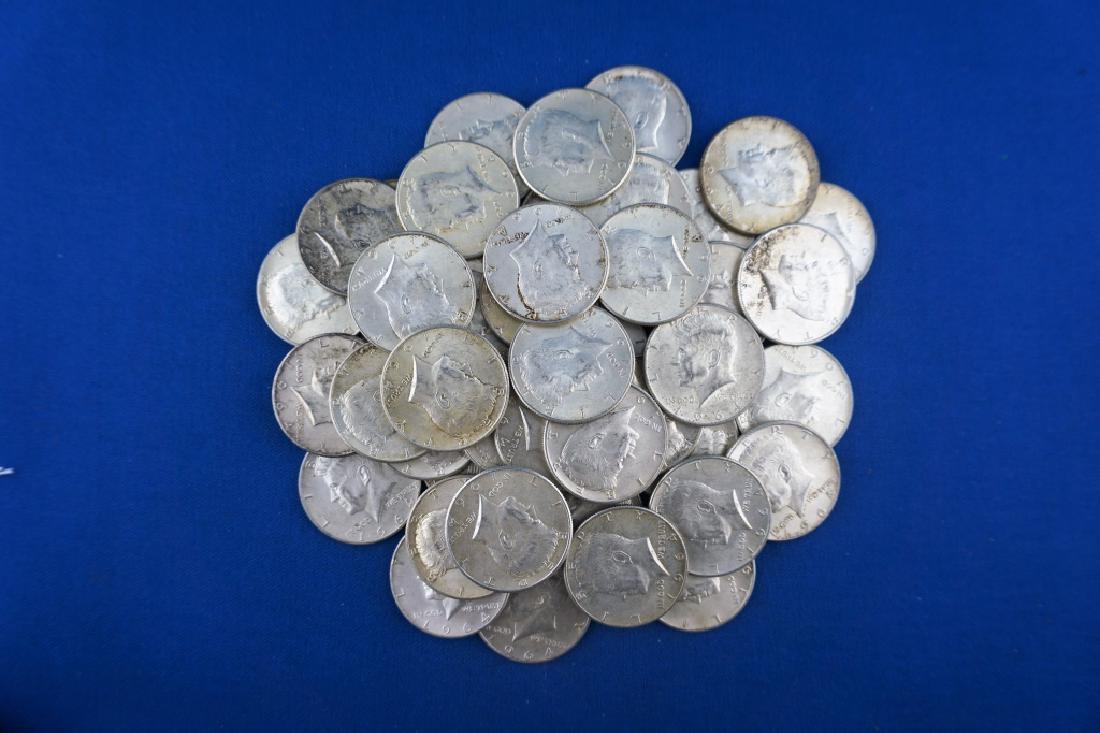 Lot of 44 40% Silver Half Dollars, along with 18 Kennedy 1964 silver half dollars; 8 Franklin half dLot of 44 40% Silver Half Dollars, along with 18 Kennedy 1964 silver half dollars; 8 Franklin half dollars, 2 Walking Liberty half dollars, $6.25 face value silver quarters; along with $8 face value s