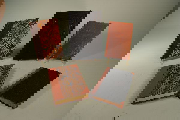 SoldGroup of 33 Foreign Language 19thC Books with Decorative BindingsAll books are very good with slightly bumped corners. Gilt stamping is beautiful and clean throughout. All books add up to around 29" of shelf space.See Sold Price
