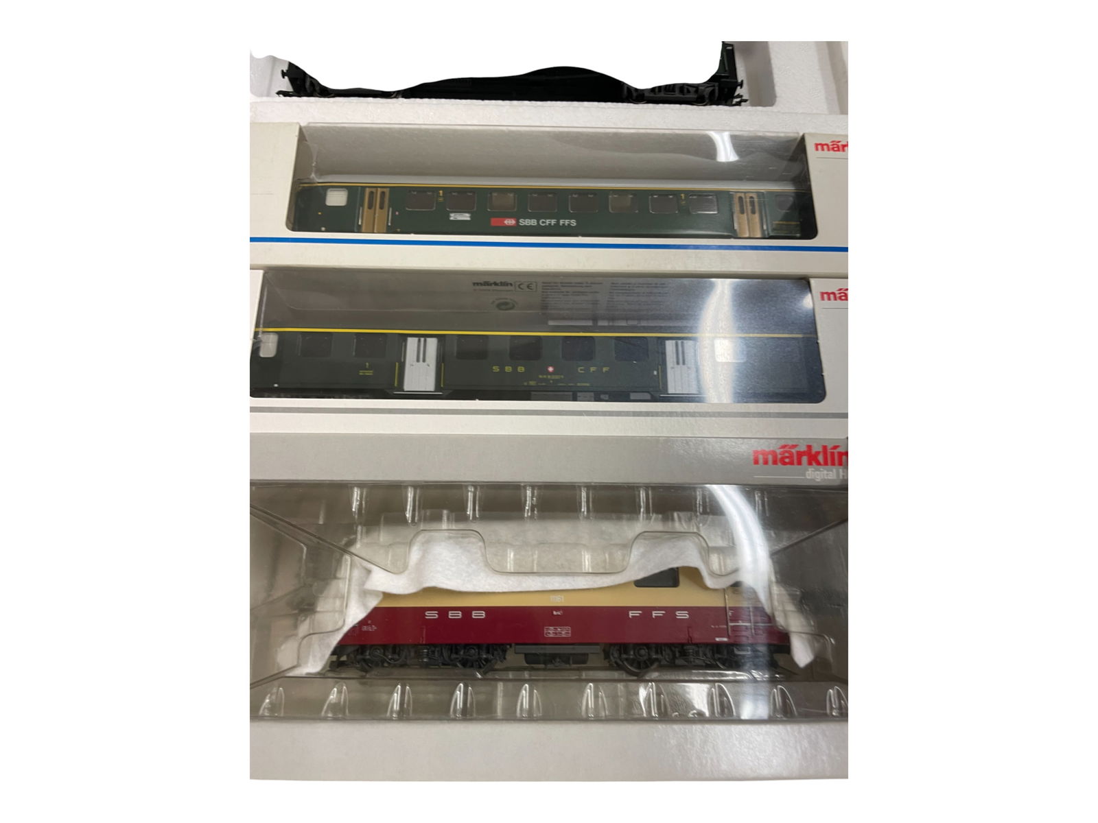 SoldMARKLIN DIGITAL SWISS TRAIN SETdigital HO ga, 34612 loco w/digital decoder added, 4367 6-car passenger set, orig boxes & inserts minor wear, C7-8.See Sold Price