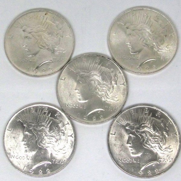 (5) 1922 BU Grade Peace Dollars
