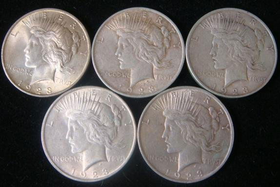 5 1923 PEACE SILVER DOLLARS, AU-50