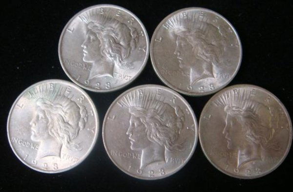 5 1923 Peace Silver Dollars, Uncirculated Conditio