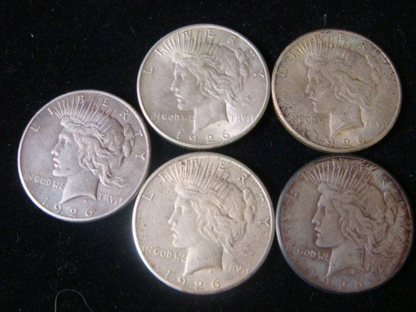 5 1926 PEACE SILVER DOLLARS, Circulated Condition