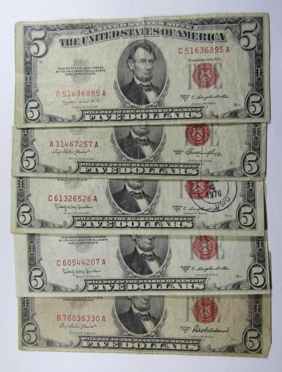 SoldU.S. 5 Dollar Red Seal Currency NotesU.S. 5 Dollar Red Seal Currency Notes. Including 1953 Star Note, Sequential notes and 1928 notes. Approx 20 pieces.See Sold Price