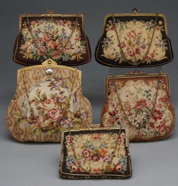 (5) 19th c. ladies' petite point purses
