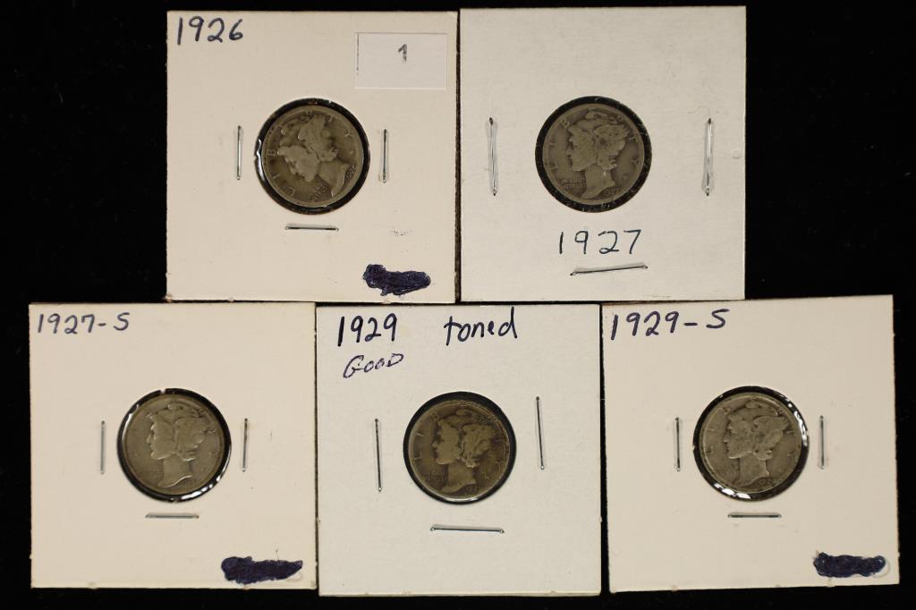 5-ASSORTED 1920'S SILVER MERCURY DIMES: 1926,