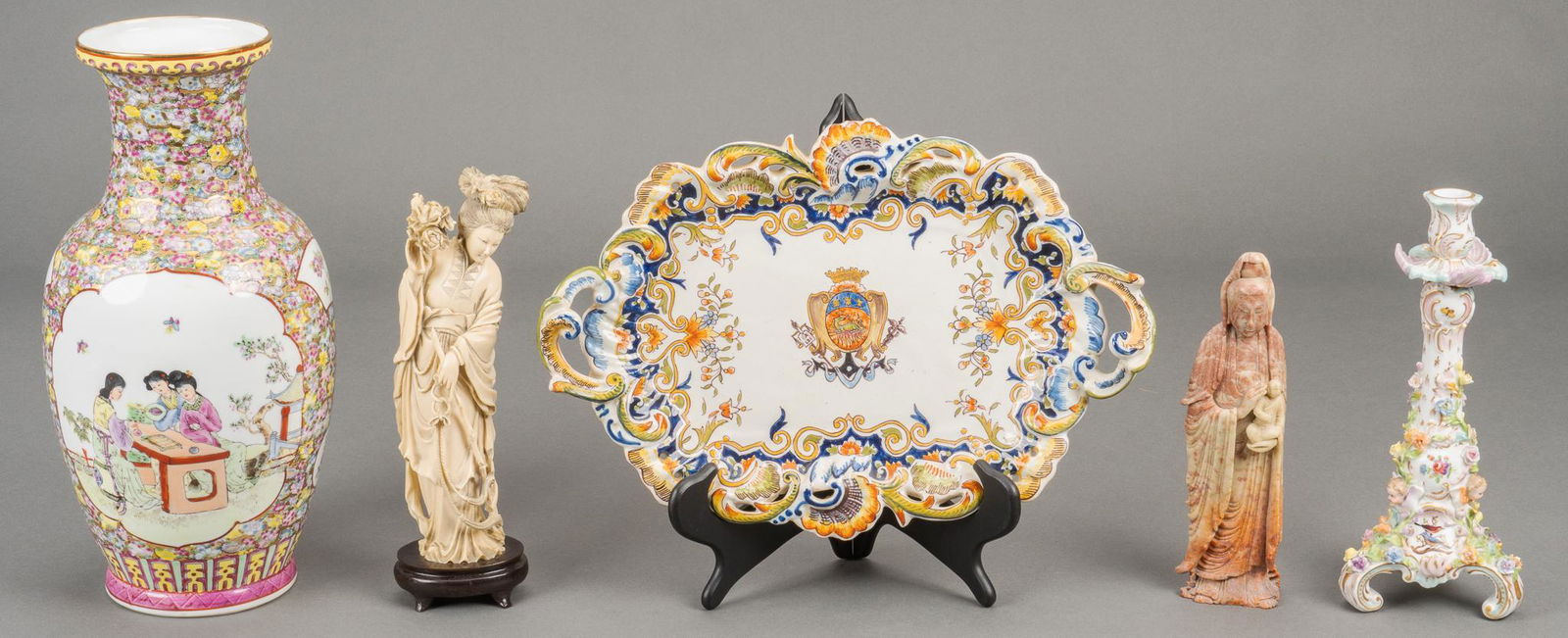 Lot 2 Vintage French Figural Ceramic Plates20 hrs LeftA composed lot of three Italian majolic style polychrome decorated and glazed ceramic objects7 days LeftA composed lot of two Italian Napoli porcelain vase and figural group.7 days LeftA lot of four French La Vallée Paris and Sèvres-style decorated porcelain tableware objects7 days LeftLot of porcelain (4x)1268 Lots AwayLot of (3) Art Pottery Pieces Roseville & Van BriggleMar 15, 202619th Century Meissen Porcelain Figurines – Set of the Four SeasonsRosenthal, Limoges, & Others - Porcelain Pieces, Group of 7Feb 26, 2026Antique French Old Paris Porcelain UrnsFeb 28, 2026Pair Jacob Petit Old Paris Porcelain Cornucopia Vases SwansMar 15, 2026Famille Rose Bowl, Oxblood Vase, Statuette5 days LeftGroup of Wedgwood Pottery Vases and MoreMar 07, 2026Three Porcelain Figural Groups22 mins LeftFour Chinese Porcelain ArticlesFeb 27, 2026Group of Assorted Porcelain Dresser ItemsMar 07, 2026A collection of 12 old Brussels and Paris style decorated porcelain vases and figurines7 days Left