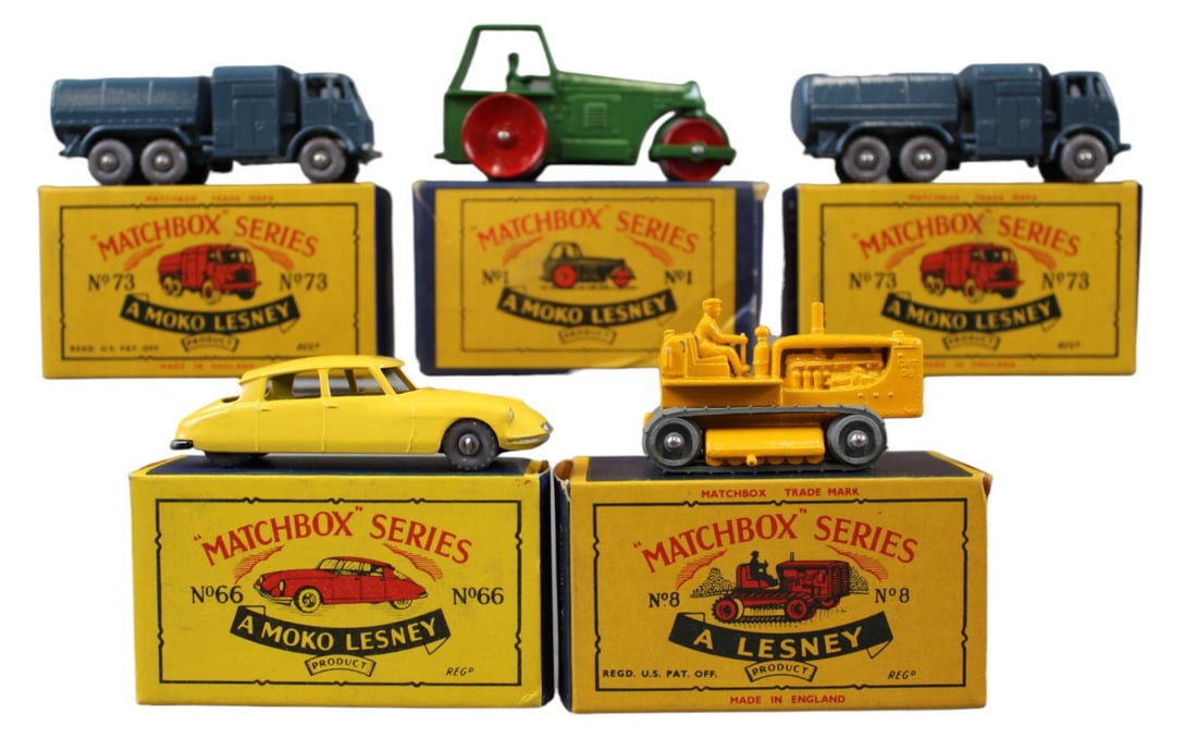 Group Of Ten Boxed Matchbox Superfast And 1-75 Series Vehicles, Including: 50 Kennel Truck, metallicGroup Of Ten Boxed Matchbox Superfast And 1-75 Series VehiclesIncluding: 50 Kennel Truck, metallic green body, silver grille, black baseplate, five white plastic dogs, thin 5 spoke wheels; 50 Articula