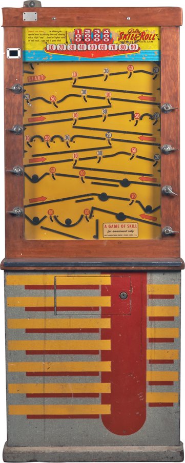 SoldBALLY SKILL ROLL PINBALL MACHINEThere were five Bally "skill roll" type games made. The Skill Roll #601 (1958, 1500 produced) was the first in the series, and has eight nickel flipping levers (four on each side), and has no replay mSee Sold Price