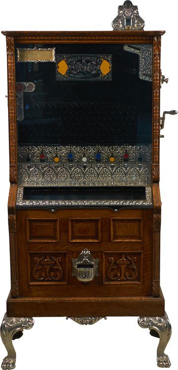Sold**5¢ Mills Novelty Mills Cricket Upright Slot Machine.Upright floor model slot machine produced by Mills Novelty between 1903-1918. This machine features beautiful quarter sawn oak with carved floral and egg & dart molding, and recessed panels, as well aSee Sold Price