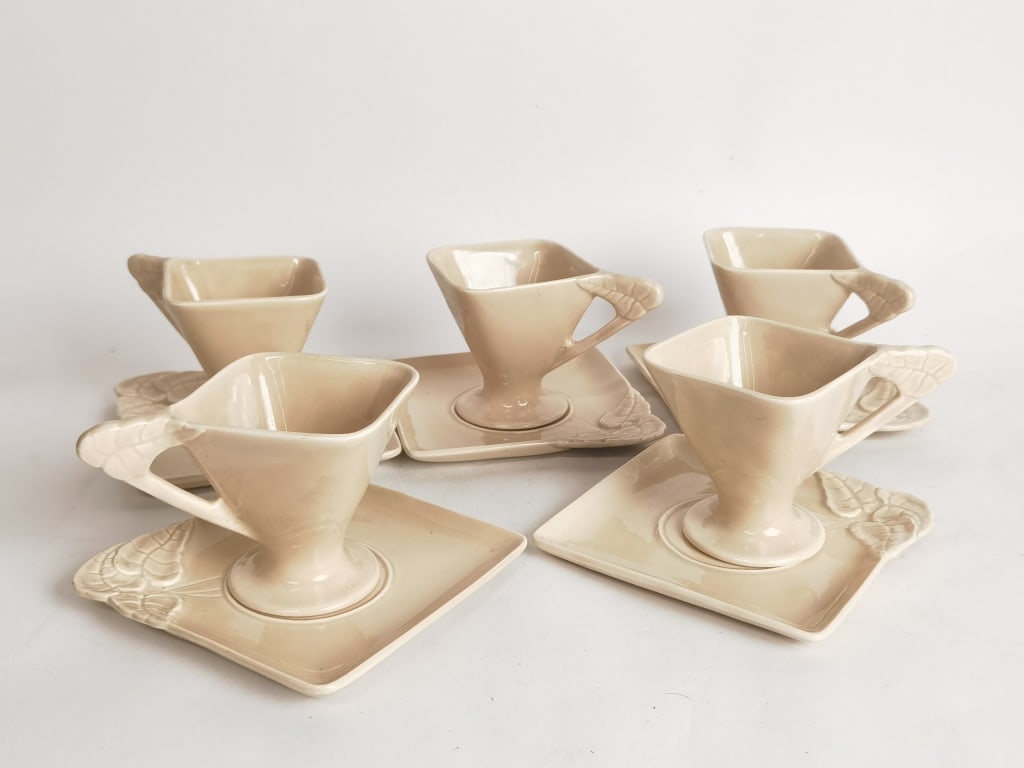 SoldITALIAN PORCELAIN CABBAGE WARE TEA SETIncludes (4) plates, (4) teacups and (4) saucers, (1) pitcher, (1) creamer, and (1) sugar. Designed to resemble leaves with butterfly handles. Dimensions: Pitcher H 7.75". Larger plates Dia. 8.5". ConSee Sold Price