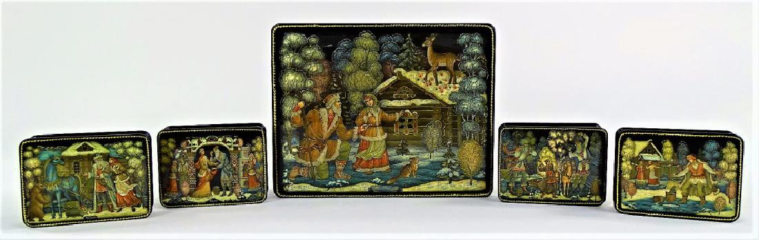 5 CONTEMPORARY HAND PAINTED RUSSIAN LACQUER BOXES