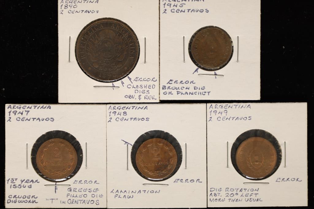 5-ERROR ARGENTINA 2 CENTAVO COINS: 1890 CLASHED