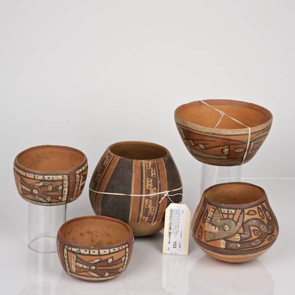 (5) Huari/Peruvian polychromed ceramic vessels